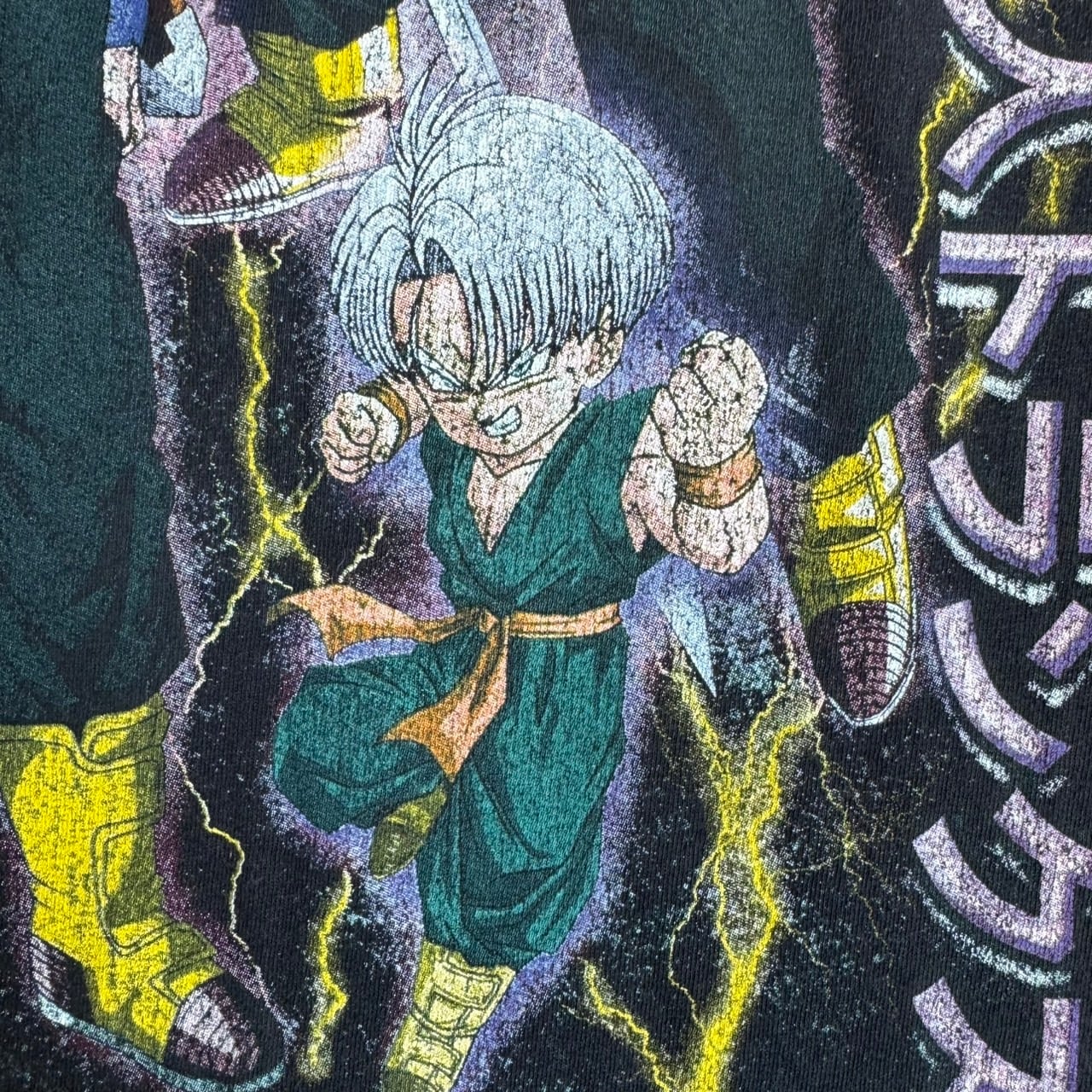 黒ボディに映える雷エフェクトと淡いプリントのかすれ感。
