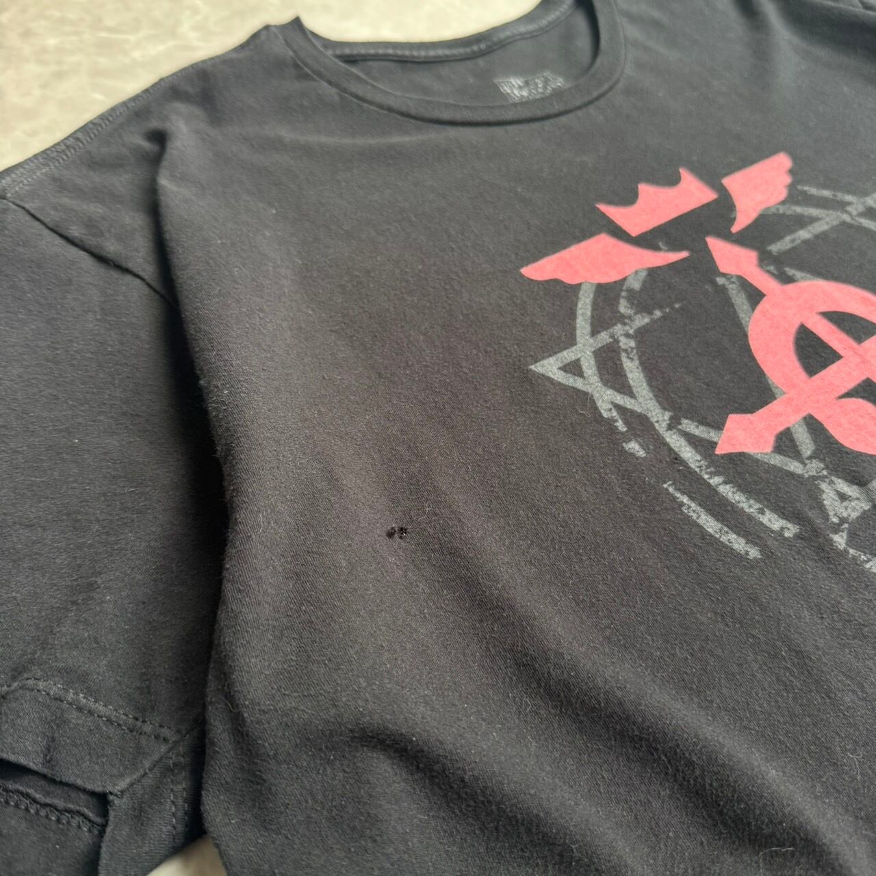 赤のフラメルと、擦れた質感の錬成陣の組み合わせが世界観にマッチしていて、派手なキャラプリントとは違う“作品の核”を着るような仕上がりです。